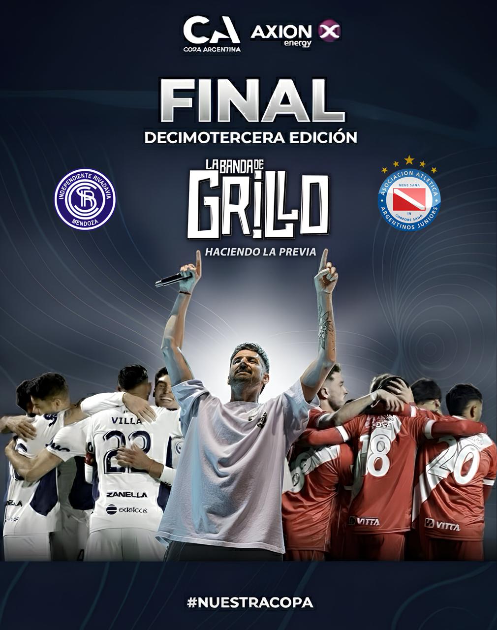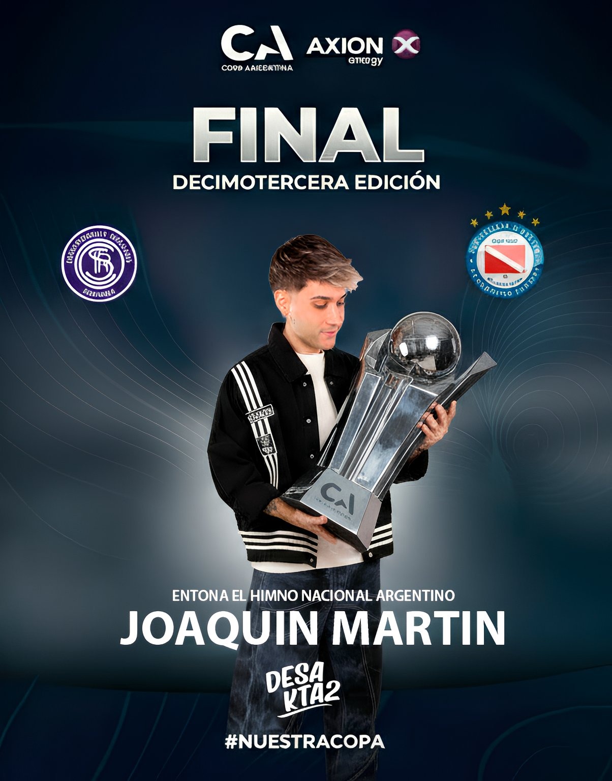 JOAQUÍN MARTIN, DE DESAKTA2, CANTARÁ EL HIMNO NACIONAL EN LA FINAL DE LA COPA ARGENTINA Y LA BANDA DE GRILLO PONDRÁN MÚSICA Y ALEGRÍA A LA PREVIA DEL PARTIDO |