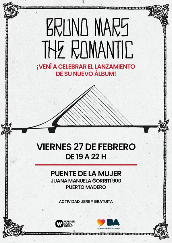 Tras una década de espera desde su último proyecto solista, el fenómeno global Bruno Mars regresa oficialmente con su cuarto álbum de estudio, The Romantic. Para marcar este hito, la Ciudad de Buenos Aires ha sido seleccionada como una de las sedes principales de la celebración internacional: el próximo 27 de febrero, el Puente de la Mujer será intervenido con una experiencia inmersiva que une la música, el arte y el romance porteño. |