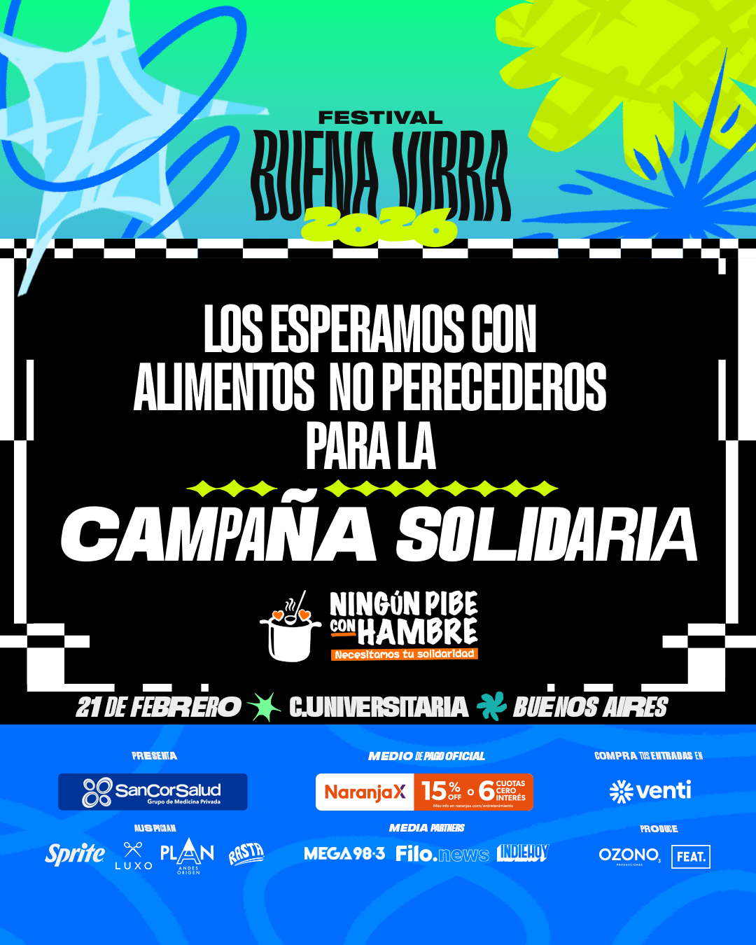 Además, este año, Buena Vibra anuncia su colaboración con Ningún pibe con hambre , una campaña solidaria que trabaja en barrios populares de todo el país, acompañando a familias y garantizando el acceso a la alimentación de niñas y niños. Durante el festival en Ciudad Universitaria, se recolectarán alimentos no perecederos que serán destinados prioritariamente a comedores comunitarios del AMBA.