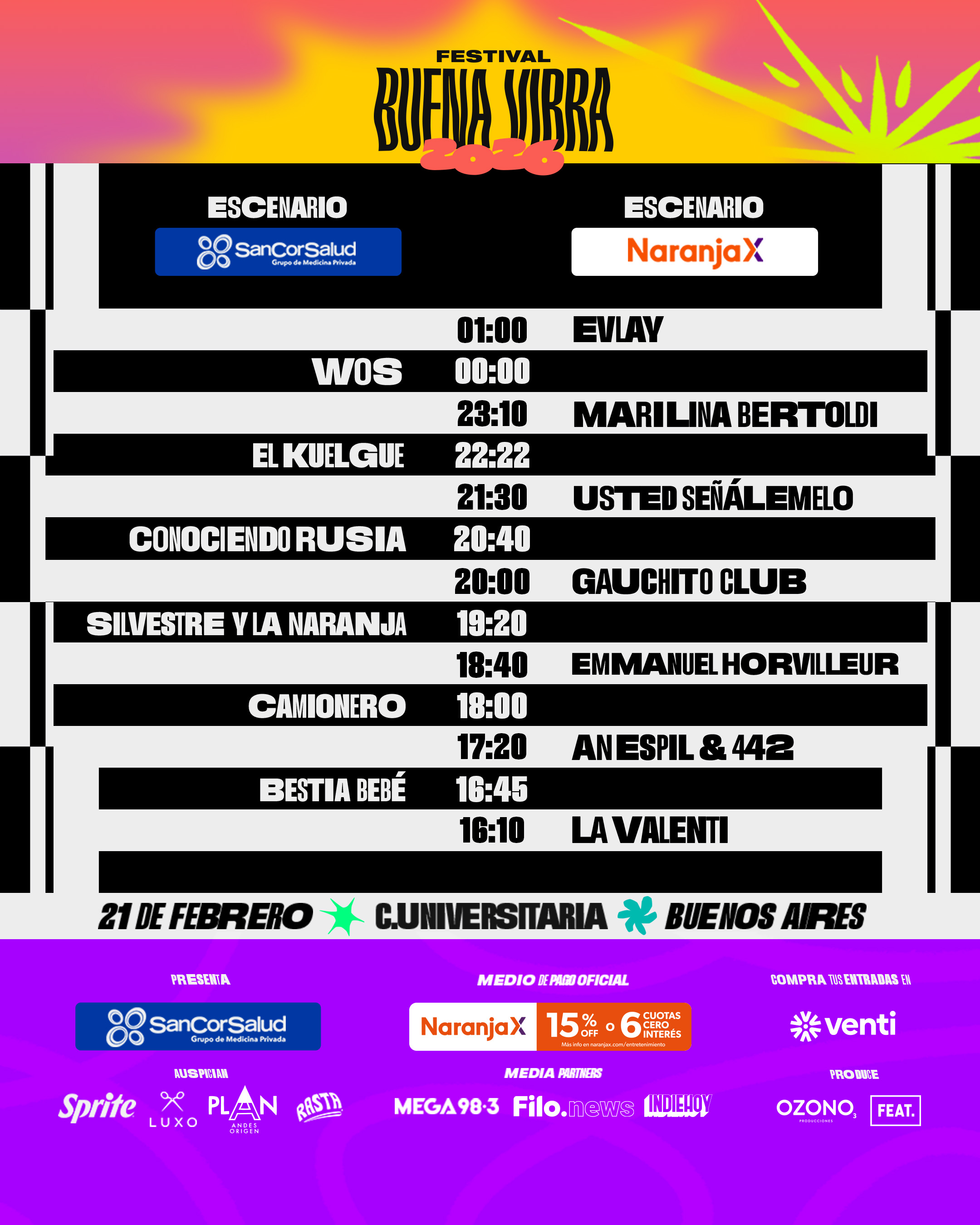 Buena Vibra continúa creciendo: el festival regresa el 21 de febrero con una nueva edición en la que reunirá lo mejor de la música en Ciudad Universitaria, a partir de las 16 hs. En una única jornada se presentarán El Kuelgue, Wos, Conociendo Rusia, Marilina Bertoldi, Usted Señalemelo, Emmanuel Horvilleur, Gauchito Club, Silvestre y La Naranja, Camionero, Militantes del Climax, An Espil 442, Bestia Bebé, Vinocio, La Valenti.
