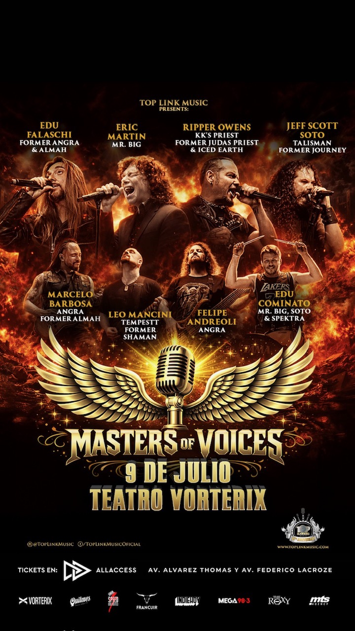 Un nuevo supergrupo reúne a cuatro leyendas del hard rock y el heavy metal: Eric Martin (Mr. Big), Edu Falaschi (Angra/Almah), Tim “Ripper” Owens (Judas Priest / KK’s Priest / Iced Earth) y Jeff Scott Soto (Talisman, Journey, Yngwie Malmsteen) se unen en Masters Of Voices, un espectáculo único que reunirá en una sola noche los grandes clásicos del hard rock y el heavy metal internacional.