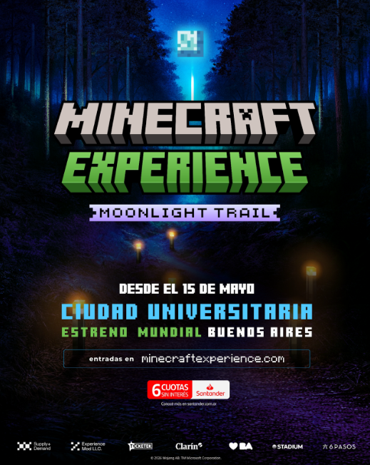 BUENOS AIRES – MARZO DE 2026 – La próxima gran aventura inmersiva de Minecraft sale de la pantalla para sumergirse en la noche, y su estreno mundial será en Buenos Aires, a partir del próximo 15 de mayo de 2026. Minecraft Experience: Moonlight Trail es una experiencia al aire libre completamente nueva donde los fanáticos podrán descubrir un mundo nocturno único, construido a partir del juego que tanto aman.