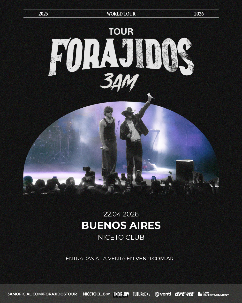 Luego de sus exitosas visitas a Buenos Aires, el dúo 3AM anuncia su esperado regreso al país y confirma que su show del 22 de abril cambia de lugar y se realizará en Niceto Club. La fecha forma parte del FORAJIDOS TOUR, que también incluirá su primera presentación en el Quality Teatro de Córdoba el 25 de abril.