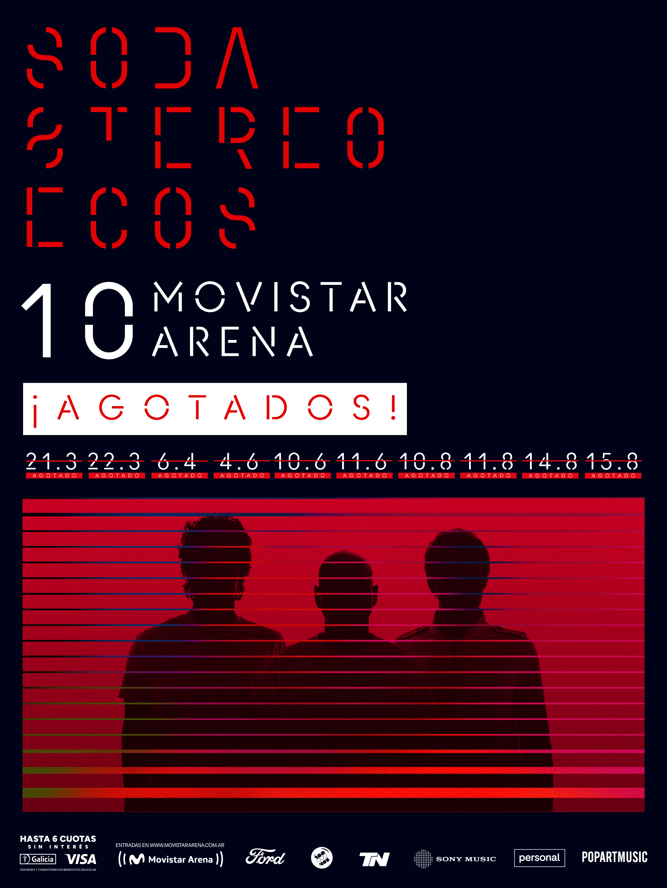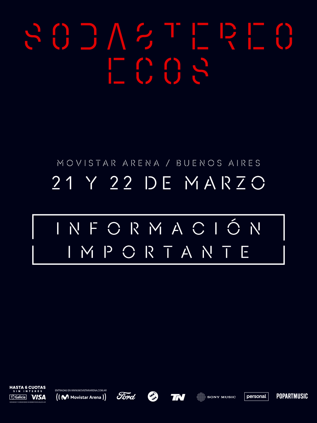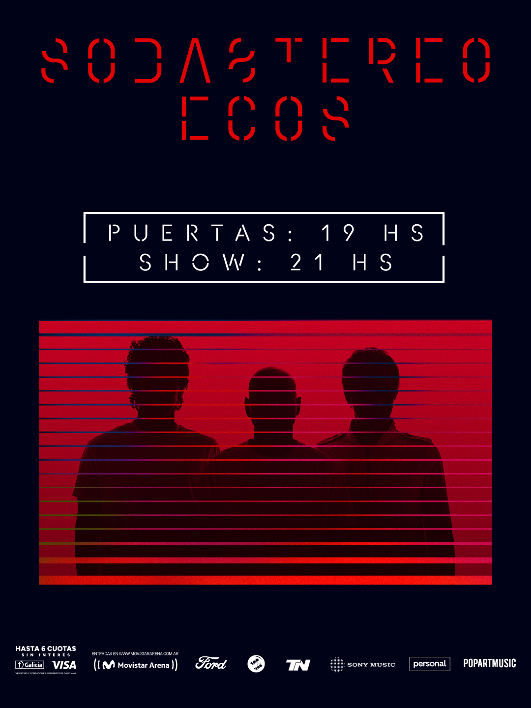 La espera llegó a su fin: Buenos Aires se prepara para recibir los primeros shows de Soda Stereo Ecos, una experiencia creada para vivirla en presente. Un acontecimiento histórico para la música en vivo. El 21 y 22 de marzo llega el ESTRENO MUNDIAL de SODA STEREO ECOS, el nuevo espectáculo de SODA STEREO que ya lleva vendidas casi 500.000 entradas en toda la región, arrasando boleterías y agotando funciones en tiempo récord. El regreso de una de las bandas más influyentes del rock en español ya es realidad.