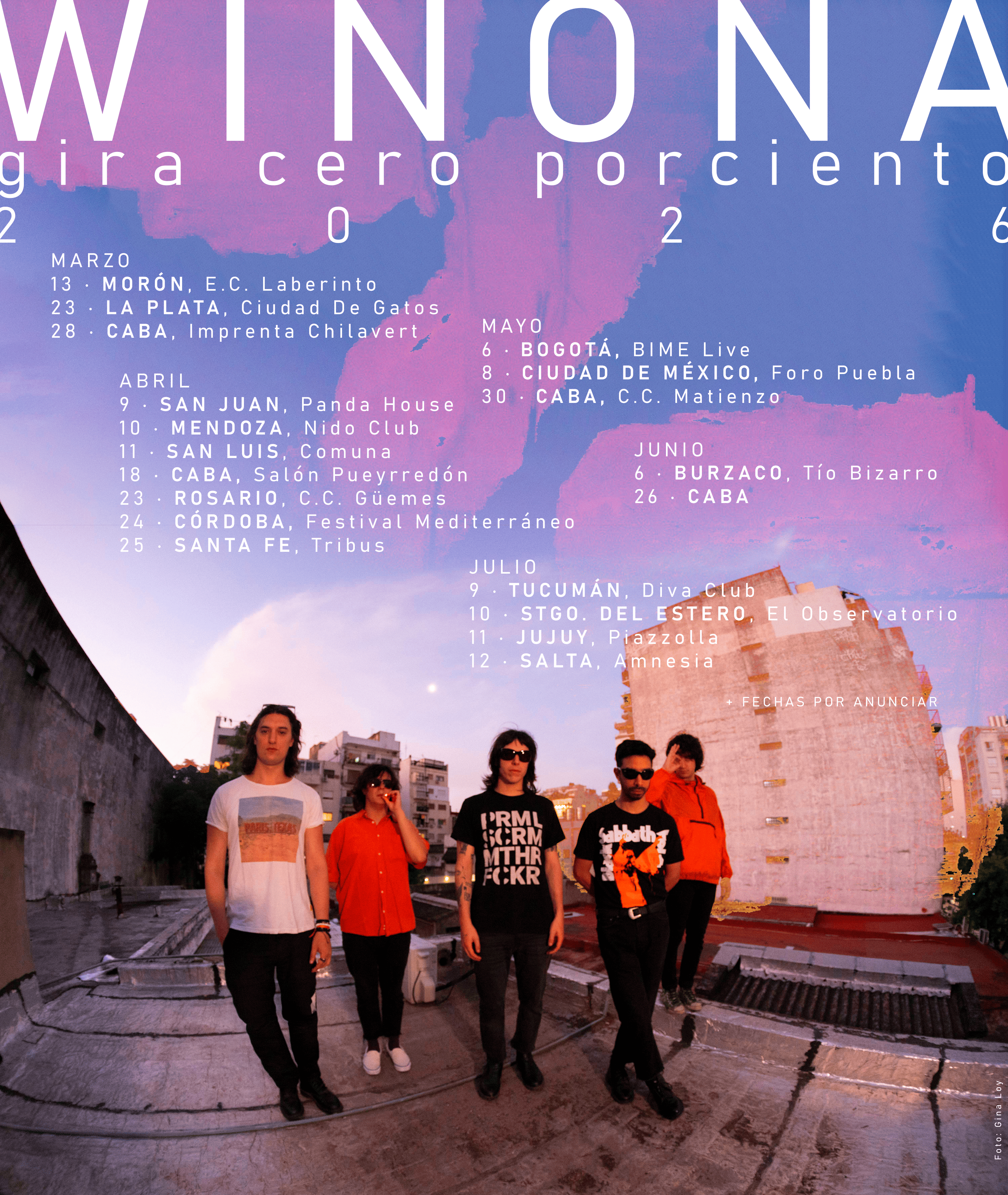 Sobre Winona Riders Winona Riders es una banda argentina formada en Morón (Provincia de Buenos Aires), fundada por Ariel Mirabal Nigrelli y Ricardo Morales en el año 2018. Actualmente el grupo está formado por Ariel Mirabal Nigrelli (voz y guitarra), Ricardo Morales (voz y guitarra), Gabriel Torres Carabajal (percusión), Francisco Cirillo (Batería) y Santiago Vidiri (bajo). Según sus integrantes, una de las principales razones por las que este proyecto nace es para convertirse en la banda que siempre quisieron ver en vivo y nunca pudieron, llevando al frente sus propias reglas y una filosofía de tocar la mayor cantidad de veces posible. El 15 de junio de 2019 debutaron en vivo en formato trío en Salas Tifón de Ramos Mejía. Oriundo del oeste, el conjunto marida rock stone, krautrock, noise y psicodelia. Comprendidos en el denominado movimiento musical ''post-pandemia'', surgido en el país en 2021 ante la necesidad de salir a las calles tras el encierro causado por el COVID-19, Winona Riders tiene cuatro álbumes de estudio publicados —Esto es lo que obtenés cuando te cansás de lo que ya obtuviste (2023), El sonido del éxtasis (2023), No hagas que me arrepienta (2024) y Quiero que lo que yo te diga sea un arma en tu arsenal (2025)— y varias grabaciones en vivo. En su joven trayectoria ya ha completado giras por todo el país, Latinoamérica y Europa, y ha valido su presencia en la industria con aperturas a artistas internacionales como The Brian Jonestown Massacre (2023), King Gizzard & The Lizard Wizard (2024) y Primal Scream (2025). Con un show en el mítico Estadio Obras de 4 horas, una tapa de Rolling Stone Argentina, una exitosa gira por Europa en 2025 —que incluyó Irlanda, Inglaterra, Francia, Alemania y España— y convocatorias a los lineups de Lollapalooza, Cosquin Rock, Primavera Sound y Music Wins, Winona Riders se ha consolidado como una de las propuestas artísticas más disruptivas, enérgicas y potentes de la escena actual argentina y mundial. |